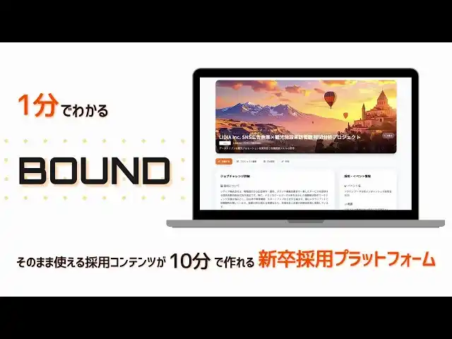 | 採用支援プラットフォーム、”BOUND(バウンド)”は、企業ごとの業務内容や特徴を反映した実務型課題=ジョブチャレンジを、AIと会話するだけで最短10分で作成し、オンライン公開できるサービスです。 | ||||||||||||||||||||