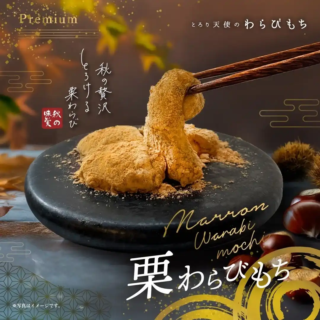 「栗わらびもち」は、和三盆糖を使用したとろっとろのわらびもちに、香り引き立つ栗ペーストを練り込み、深みのある味わいに仕上げました。口に入れた瞬間とろける食感とともに、秋らしい芳醇な栗の風味をお楽しみいただけます。 |