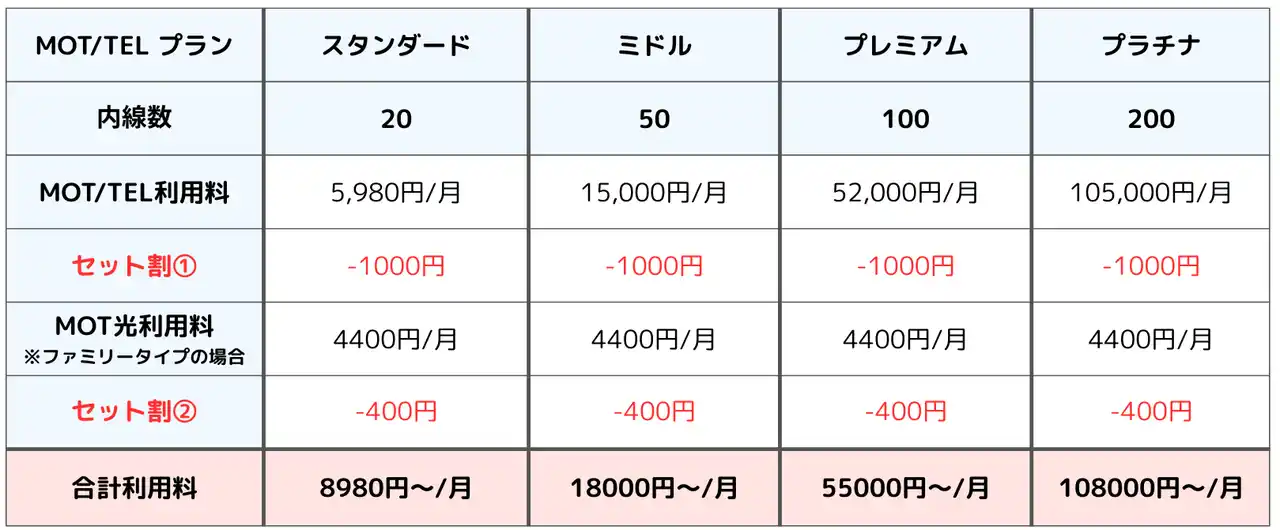 | さらに、法人専用高速インターネット回線「MOT光」と組み合わせることで、音声通話品質の向上やクラウドサービスの安定利用が可能となり、業務効率化とコスト削減を同時に実現します。 | |||