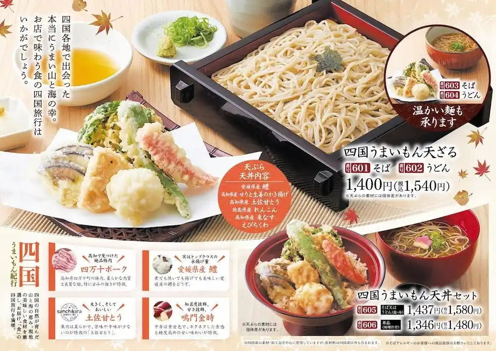 海と山の幸をぜいたくに味わえる天ぷらとおそばの「四国うまいもん天ざるそば」、ボリューム満点の「四国うまいもん天丼セット」は、毎年多くのお客様にご好評いただいている人気メニューです。 |