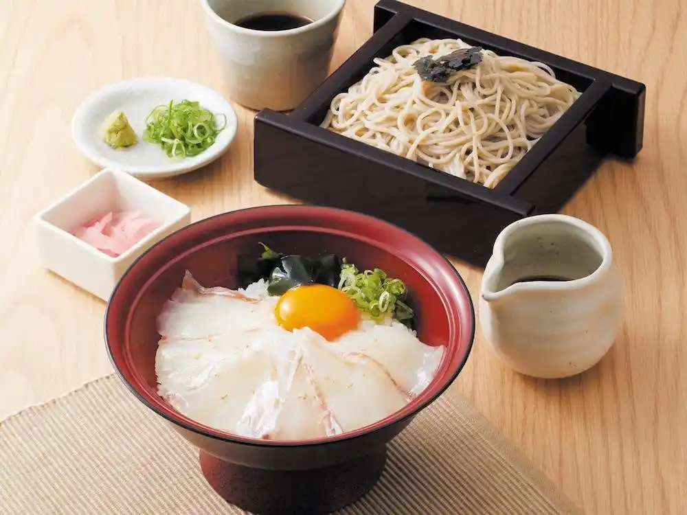 高知県産の真鯛は程よい甘みが特徴で鯛めし用のタレと玉子を混ぜておめしあがりください。セットの麺はそば又はうどん(温・冷)をお選びいただけます。 |