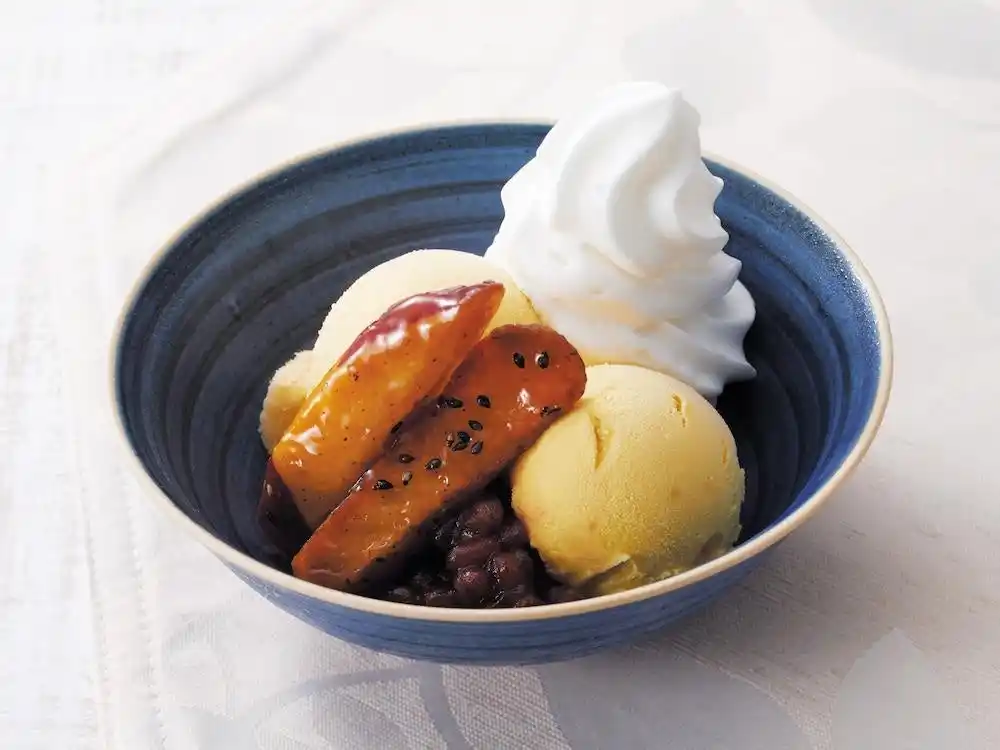 金時芋棒と鳴門金時アイスを組み合わせたぜいたくな「金時芋棒と食べる鳴門金時アイスの和パフェ」、外はカリッと中はほくほくの「金時芋棒」、そして濃厚な甘さが楽しめる「鳴門金時アイス」の3品。 |