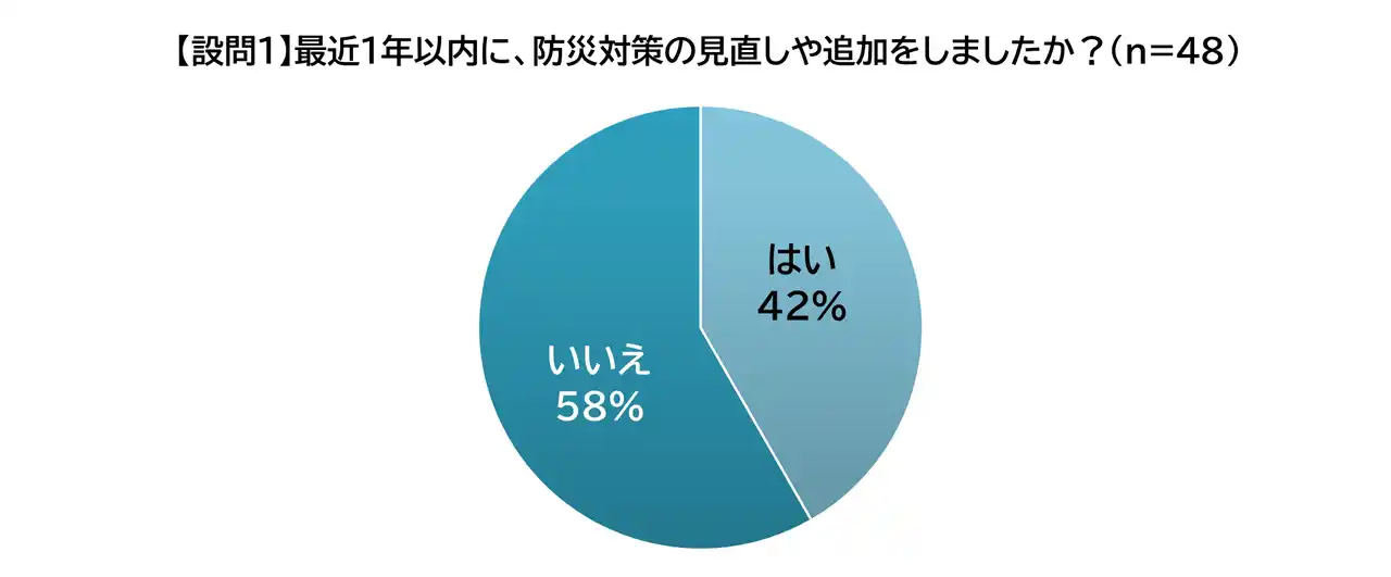 防災対策の見直しや追加に関する設問では、4割の店舗が1年以内に実施していると回答しました。一方で6割の店舗は実施していないのが現状です。 |