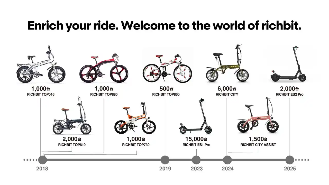 | RICHBITはAcalie創業後間もなくしてスタートした電動モビリティブランドです。「誰もが楽しめる電動モビリティ」をコンセプトに、コストパフォーマンスが高く、エントリーモデルとして多くのユーザーに愛され、2025年8月末時点でRICHBITシリーズ国内累計販売台数は30,000台を突破しました。 | |||