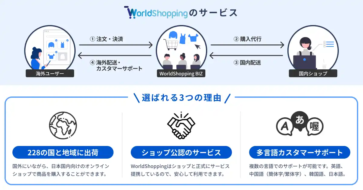WorldShoppingは、海外カスタマーが日本のECサイトで商品を購入できるサービスを提供しています。日本語のみのECサイトでも、購入代行・決済・海外発送までを一括サポート。 |