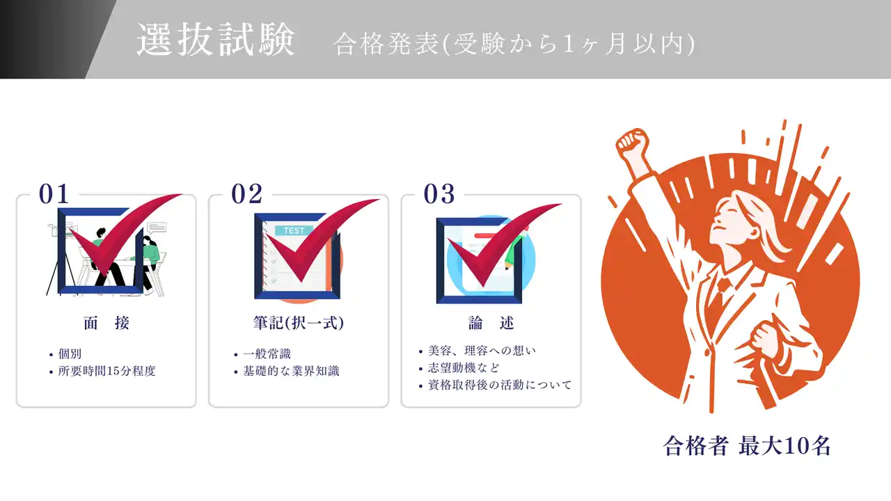 ・ 選抜試験:年4回(12月2日、3月中、6月中、9月中)開催、各回合格者最大10名 |