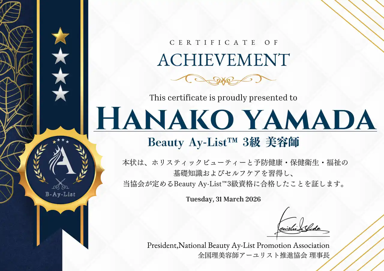 (例) Beauty Ay-List(TM)︎3級 合格証書 |