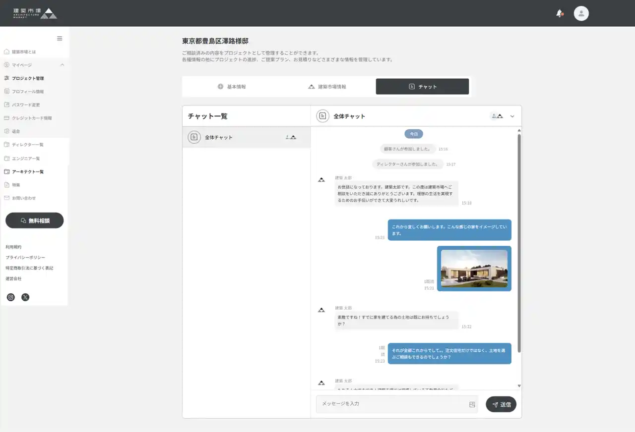 | 実際に施主と建築士・職人がやり取りを行うのは、会員登録後にログインできる専用プラットフォームです。9月1日のローンチと同時に利用可能となり、チャット機能やプロジェクト管理ページを通じて建築プロセスを一元管理できます。 | ||||||||||||