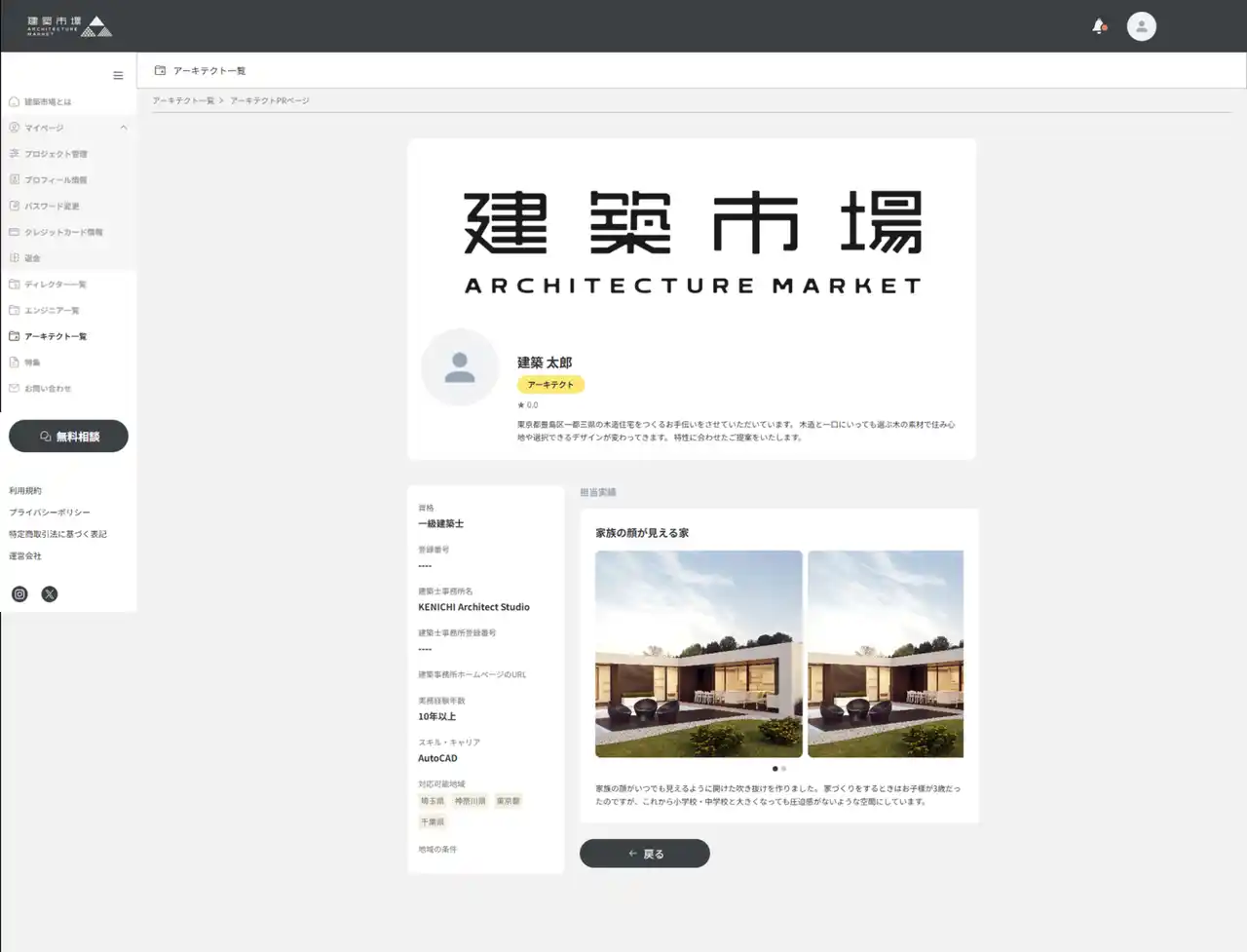 | 「建築市場」は、注文住宅を建てたい施主と建築士・職人を直接つなぐマッチングプラットフォームです。従来のハウスメーカー経由での家づくりとは異なり、セルフビルドという手法を活用することで、不要な中間コストを削減し、より安価で自由度の高い注文住宅の実現を目指します。「理想の家を、適正な価格で。」 それが「建築市場」の新しいスタンダードです。 | ||||||||||||