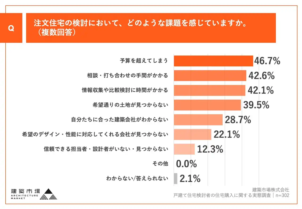 | 日本の注文住宅市場では、多くの施主がハウスメーカー経由で住宅を建築しており、その過程で多数の業者が介在することで価格が不透明化し、不要なコストが発生してきました。実際に、当社が2025年8月26日に、戸建て住宅の購入を検討している方を対象とした緊急調査(※1)では、6割以上が、自分達の希望に沿って建築する「注文住宅」を検討していますが、そのうちの約半数が「予算を超えてしまう」ことを課題として実感しています。施主にとっては住宅の設計自由度が低く「カタログから選ぶパターン化された家づくり」に留まりがちです。 | ||||||||||||