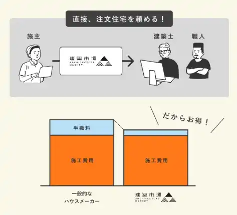 | 「建築市場」は、施主と建築士・職人を直接つなげることで、従来の住宅建築で発生していた不要な中間コストを削減し、自由度の高い家づくりを実現します。 | ||||||||||||