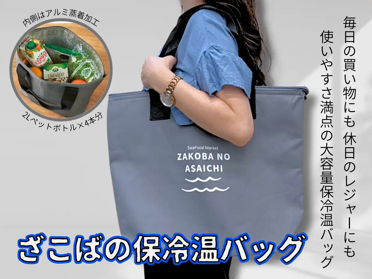 三上:そうなんです! ご購入いただいた5名様にはもれなく、『ざこばの朝市』オリジナルの保冷バッグをプレゼントしております。こちらも今回のために作成した限定品。たっぷり大容量ですから、普段のお買い物にはもちろんアウトドアイベントやスポーツ観戦時にも重宝いただけますよ。