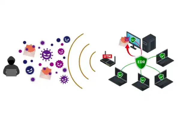 ・ UTMによる外部からの攻撃の遮断: 企業ネットワークの入り口でUTMが異常な通信を検知し、外部からの侵入を防ぎます。