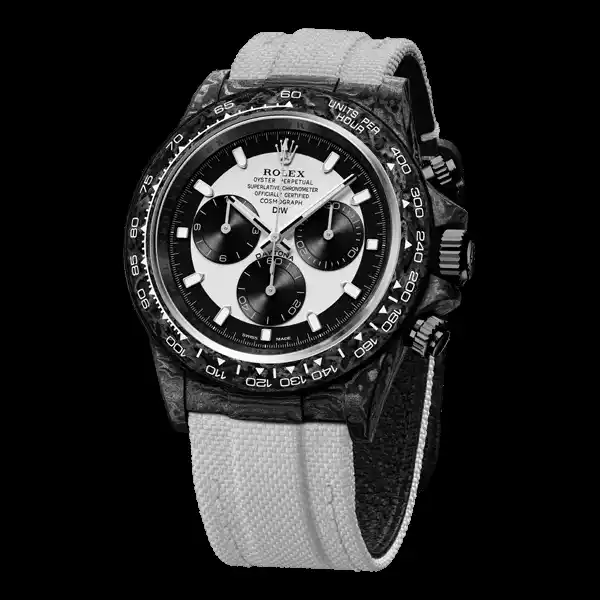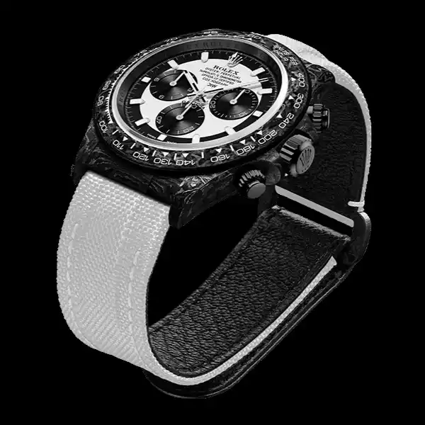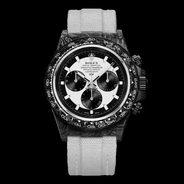 本モデルは、伝統的なツートーンのロレックス デイトナをモチーフに、ブラックカーボンケースとホワイトダイヤル、インデックスが織りなす洗練されたデザインが特徴です。文字盤と調和するスモーキーホワイトのストラップや、微細な仕上げまでこだわったケースからは、職人の技とこだわりを感じることができます。シンプルながら力強く、どんなファッションやシーンにも自然に溶け込む特別なモデルに仕上がっています。 |