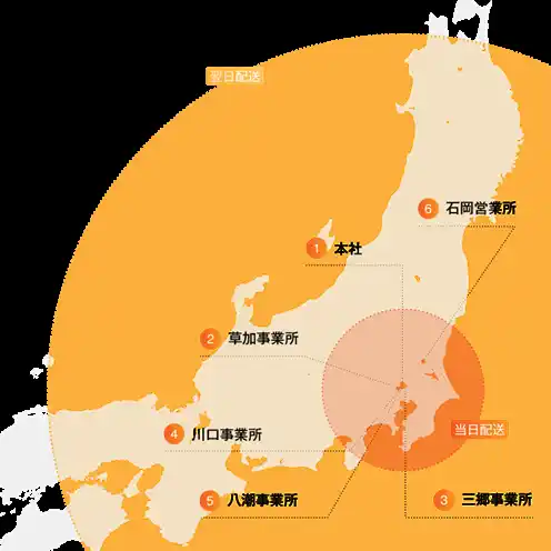 ★対応エリア 関東一円であれば当日着、甲信越には翌日着で対応可能です。 また、協力会社の輸送ネットワークにより、四国を含む日本全国へ輸送を展開しています。 |