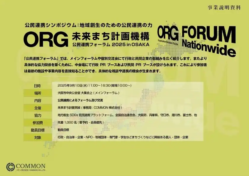 未来まち計画機構(事務局:COMMON株式会社 京都市下京区 代表取締役 増田勇樹)は、2025年9月10日(水)大阪市中央公会堂にて「公民連携フォーラム2025in大阪」を開催いたします。 |