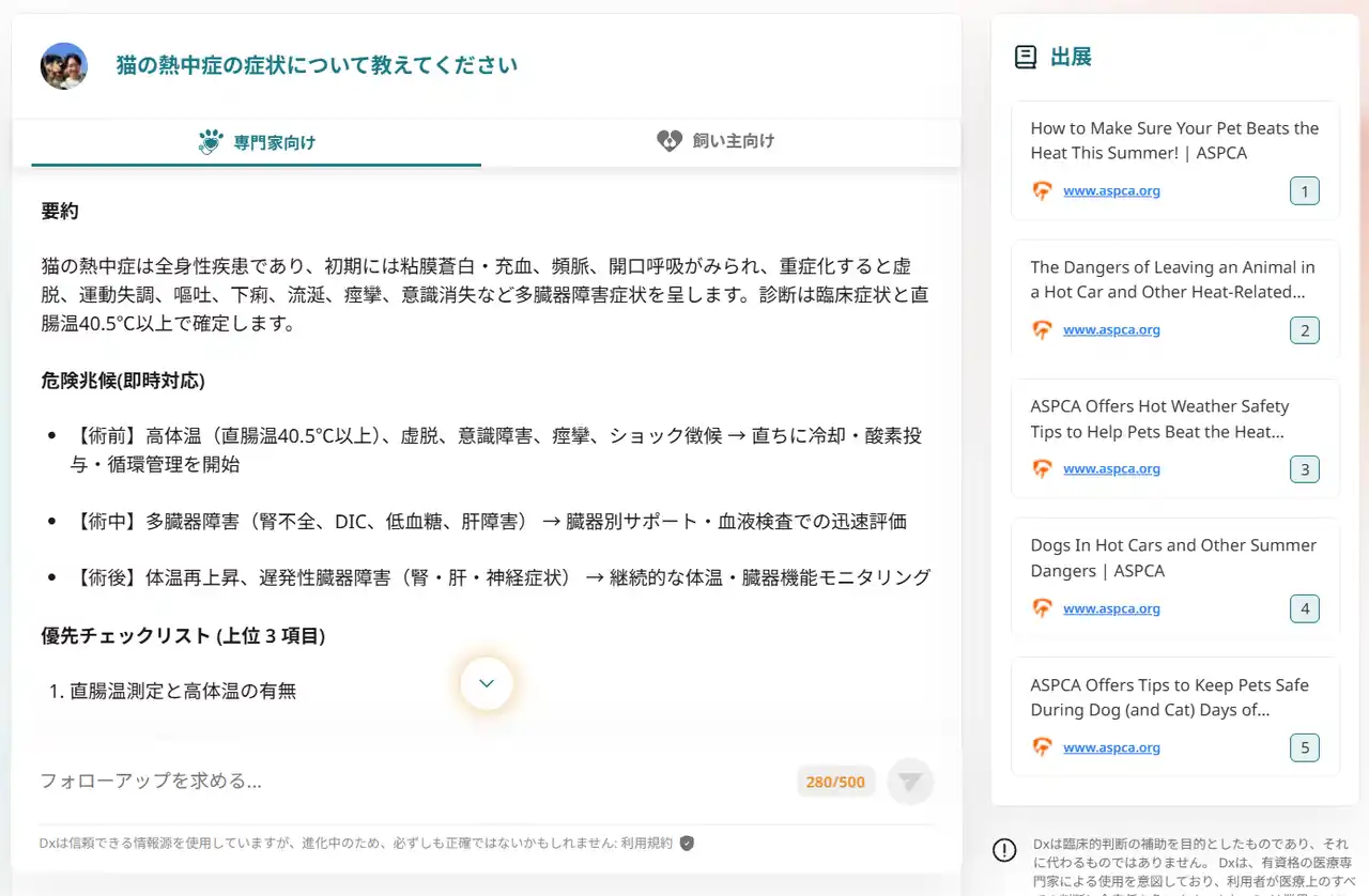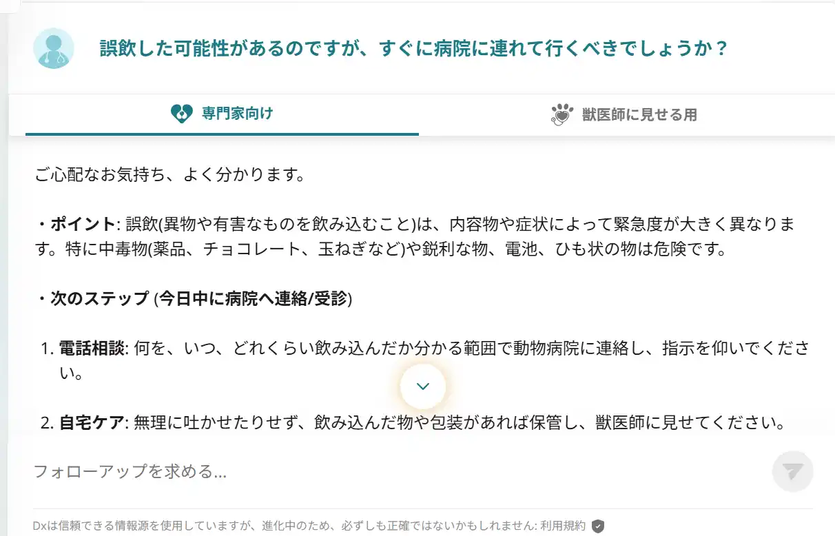 ※Vets Ask AIは臨床的判断の補助を目的としたものであり、臨床判断を置き換えるものではありません |