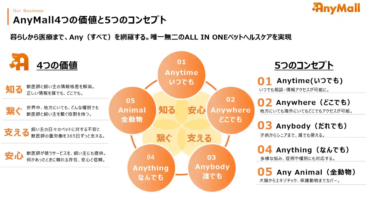 AnyMallは「Anytime, Anywhere, Anybody, Anything, Any Animal」を理念とし、いつでも、どこでも、誰でも、すべてのペットに情報と体験を届ける革新的なサービスを創り出します。さらに将来的には160言語以上に対応し、日本から世界へ ― 知識がまだ届いていない地域へも支援を広げ、すべての動物と人へ “幸せに生きる未来” を届けてまいります。 |