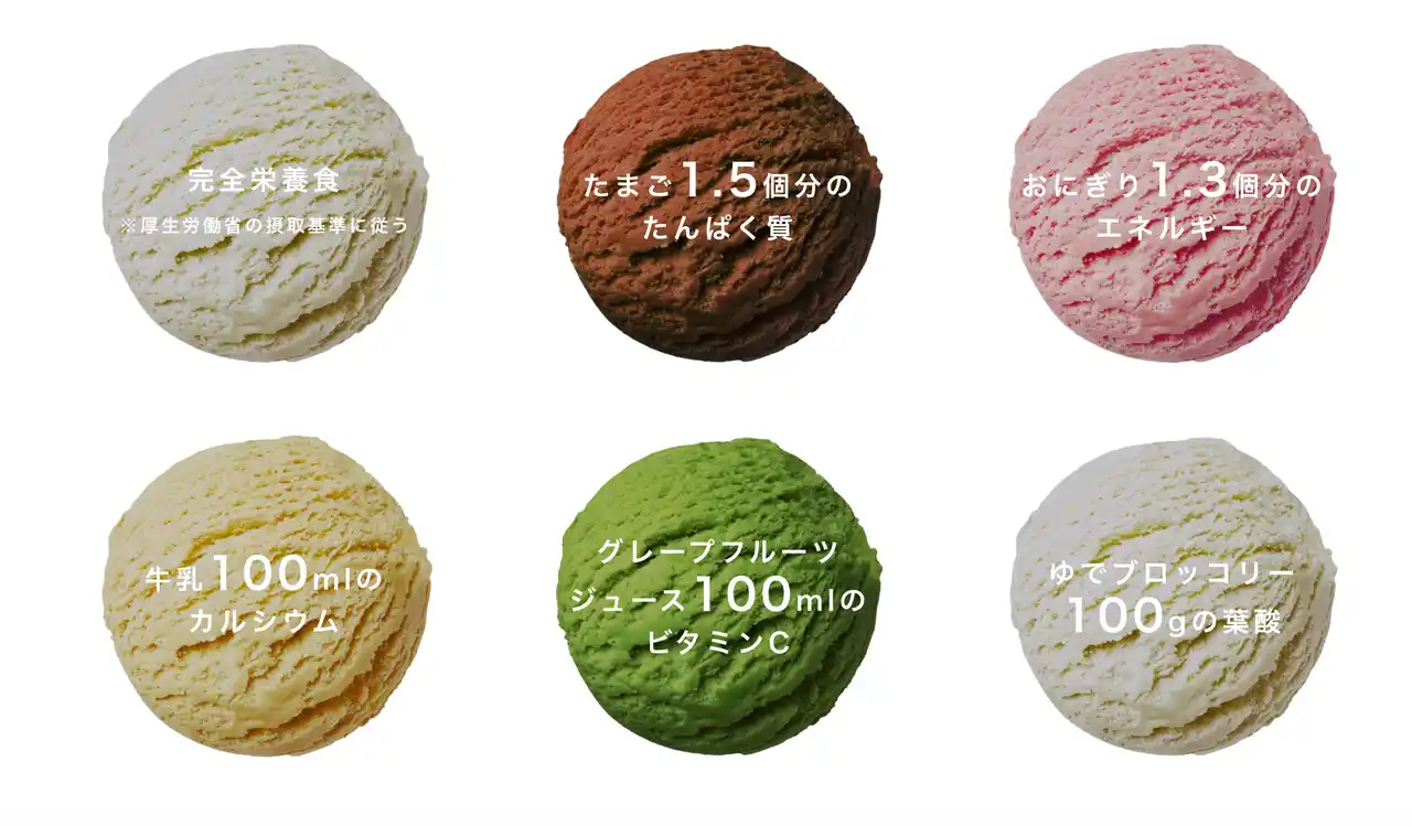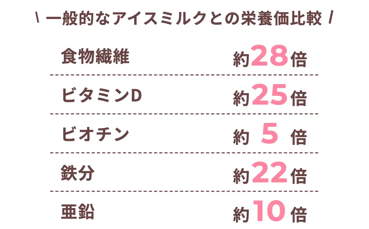 栄養の特徴(一般的なアイスミルクとの比較・同量比)食物繊維:約28倍、ビタミンD:約25倍、鉄分:約22倍、亜鉛:約10倍、ビオチン:約5倍、アマニ油・大豆油などの不飽和脂肪酸も配合。33種類の栄養素をバランスよく含有し、摂食・嚥下に配慮した食感を追求。 |