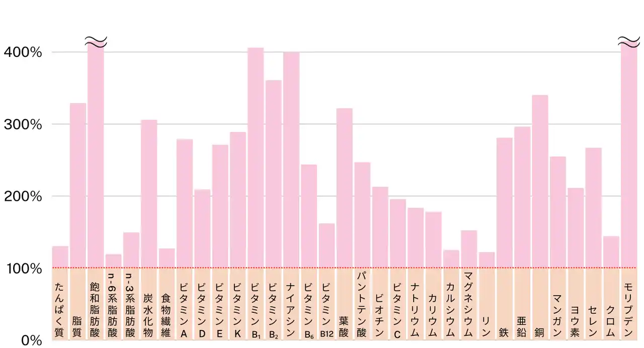 ※厚生労働省が定める日本人の食事摂取基準(2025年版)に基づきKcalあたりの基準値を100%とした際の充足率 |