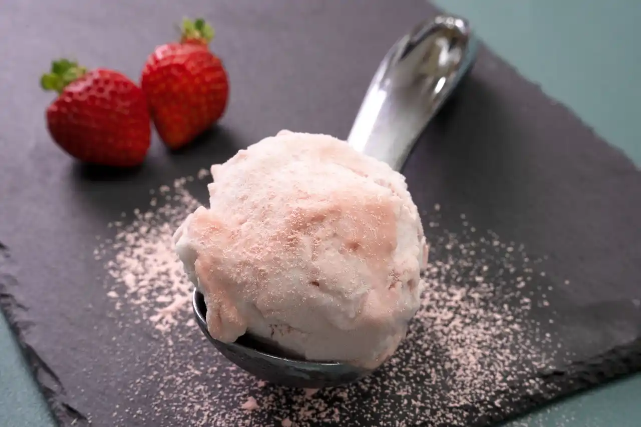 あまおうをふんだんに使ったアイスです。苺と乳、双方の味をしっかりと感じてもらえるよう試作を重ねて開発しました。いちごの果肉感も楽しめるアイスとなっています。さらに、いちごパウダーをトッピングすることで、より濃厚ないちごの風味が際立ち、贅沢な味わいを楽しめます。 |