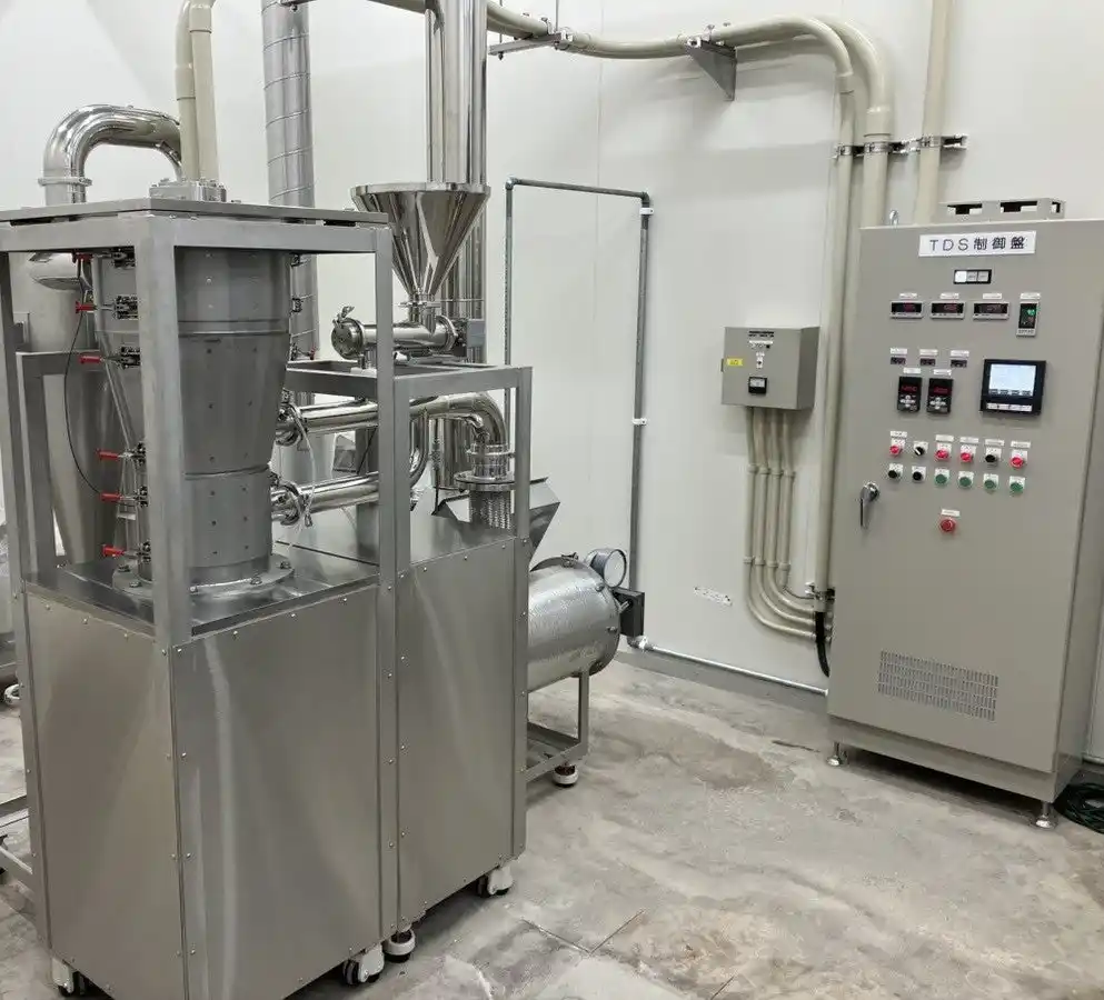 いちごをパウダー状にする装置。瞬時に乾燥と粉砕を完了する特許システムを採用しているため、いちごを傷めずパウダーにできます。イチゴ本来の色味や栄養をまるっとパウダー化できるこだわりの製法です。 |