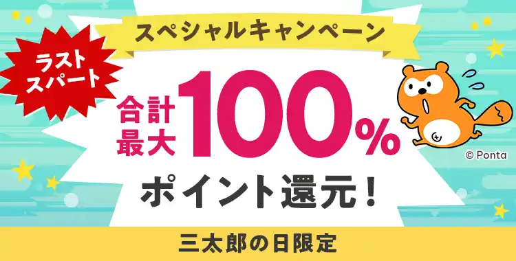 そのほか、抽選で2,000名さまに、最大 73%の Ponta ポイント(au PAY マーケット限定)があたり、実施中のキャンペーンや特典とあわせると合計最大100%のポイント還元となるチャンスがあります。 |