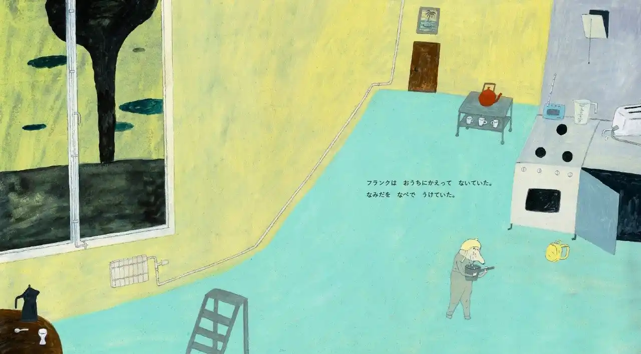 家に帰ると、フランクの目からは寂しさで涙があふれます。その涙を鍋に入れて、マーマレードを作る毎日……。そんなフランクの姿が、ユーモアたっぷりに描かれます。 |