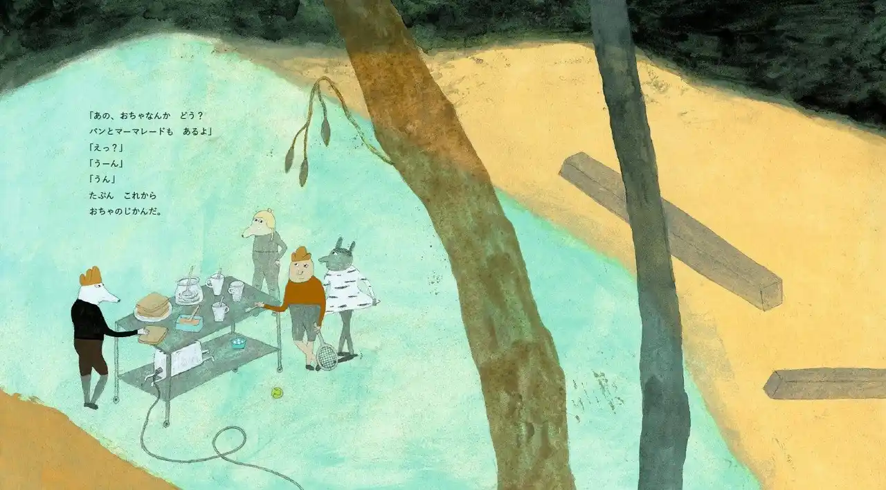 そのあと、フランクと3人組は、みんなでお茶会をすることに。フランクは3人に「あの、おちゃなんか どう?」と声をかけます。3人の反応は「えっ?」「うーん」「うん」。 |