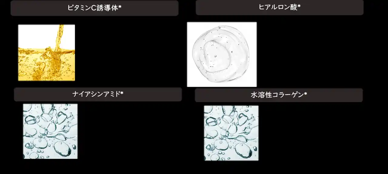 *1 ハリ成分 DNA-Na、*2ハリ成分 DNA-Na オタネニンジン根エキス *3 整肌成分 テトラヘキシルデカン酸アスコルビル |