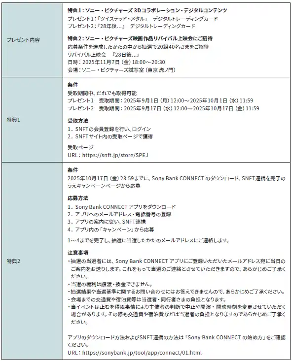さらに2つ目の特典として、対象期間中に、Sony Bank CONNECT のダウンロードおよびSNFT(*2)連携などの所定の条件を満たしたかたの中から抽選で20組40名さまに、東京・虎ノ門にあるソニー・ピクチャーズ試写室でのリバイバル上映会にご招待します。今後第三弾も実施予定ですので、ぜひご注目ください。 |