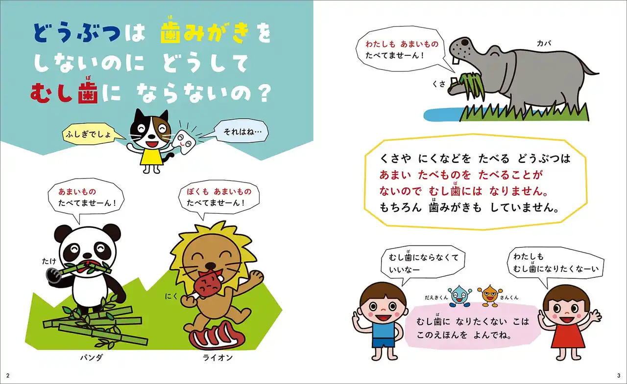 | 「動物は歯をみがかないのに、どうしてむし歯ができないの?」「歯は鉄よりカタイってホント?」「歯は、だえきの力を借りて、むし歯菌によって溶かされた穴を、自分で修理するって知ってた?」「子どもがむし歯になりやすい、3大かくれ場所はどこだ?」知ってるようで知らない、むし歯のできる理由と予防法。しっかり学べば、大きくなってもずーっとむし歯ゼロで過ごせる! | ||||||||||||||||