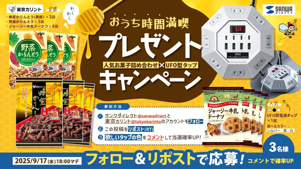 | サンワダイレクトの公式X(旧Twitter)では創業祭を記念して、『人気お菓子詰め合わせ&UFO型電源タップ』が3名様に当たる、『東京カリント株式会社』様とのスペシャルコラボプレゼントキャンペーンが開催決定! | |||