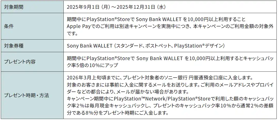| ソニー銀行株式会社(代表取締役社長:南 啓二/本社:東京都千代田区/以下 ソニー銀行)は、2025年9月1日(月)より、キャンペーンを実施しますので、お知らせします。 | |||