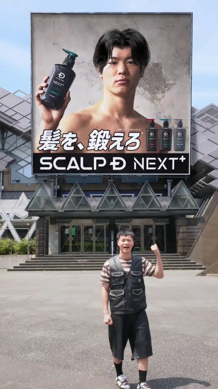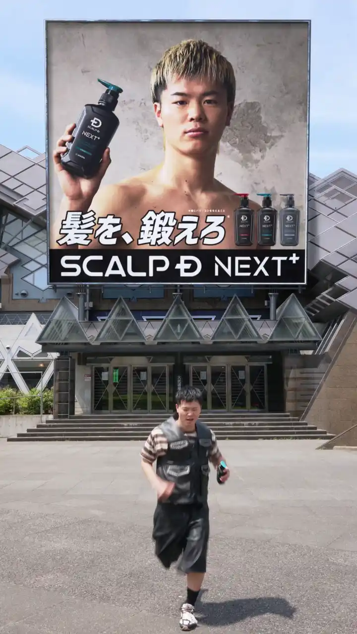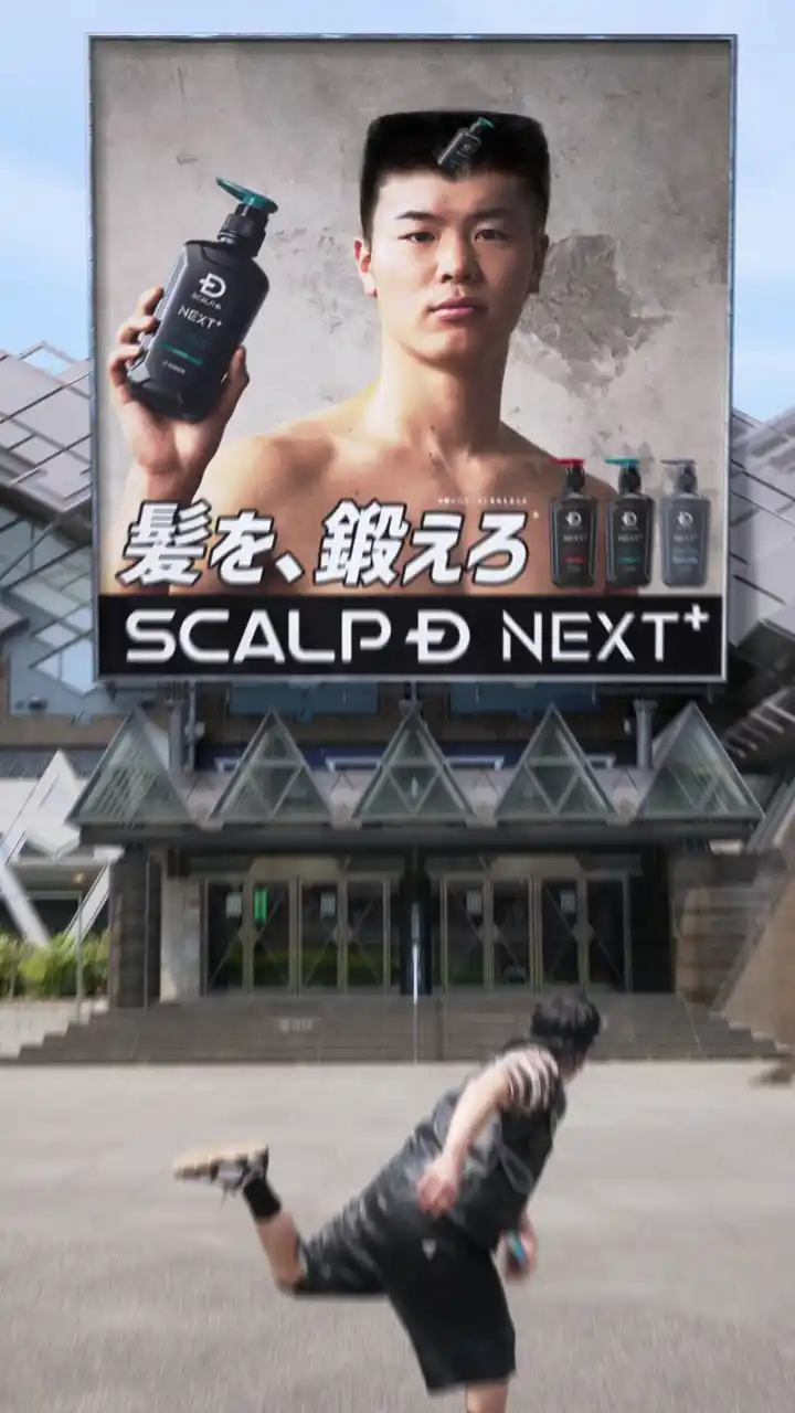 動画は街頭広告(OOH)を背景に、カメラに向かって走ってくる那須川天心選手の姿から始まります。天心選手は「今からこの看板の髪型変えちゃいたいと思います!」と宣言し、手元の「スカルプD NEXT+」のボトルを看板に向かって投擲します。すると1投目の結果、看板内の天心選手が角刈りスタイルに変化。これを見た天心選手は「親に怒られそう!(笑)」と率直にコメントします。 |