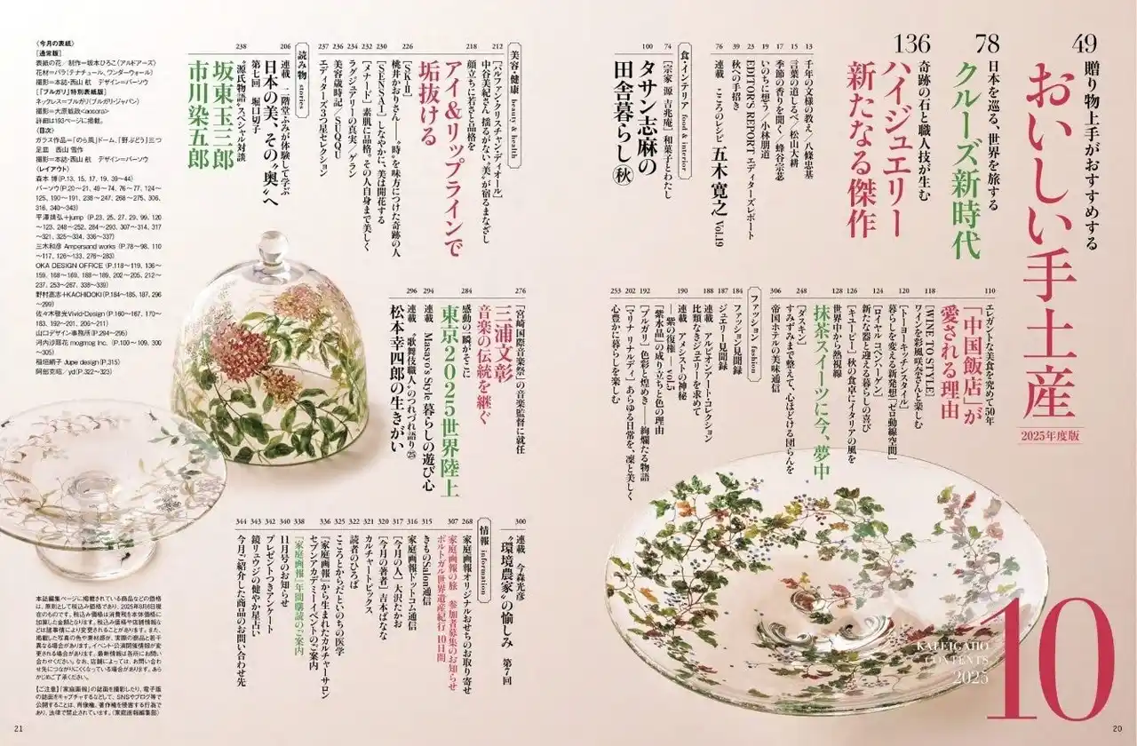 株式会社世界文化社は、『家庭画報 10月号』を9月1日(月)に発売します。巻頭特集「2025年度版 おいしい手土産」では、贈り物上手の方々から”心遣いが伝わる手土産”を教えていただきました。「クルーズ新時代」では、日本発着の最新ラグジュアリークルーズ船の旅をご案内。さらに、有村架純さんが初登場する新作ハイジュエリーの大特集、大人気連載「タサン志麻の田舎暮らし