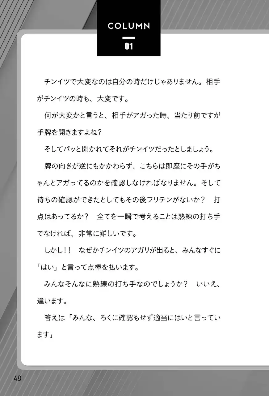 麻雀にとって大事な多面待ちの覚え方から、何待ち!? 何切る!? 何鳴く!? チンイツ行く? テンパイどう変える? とこれ一冊であなたもチンイツマスターになれる! |