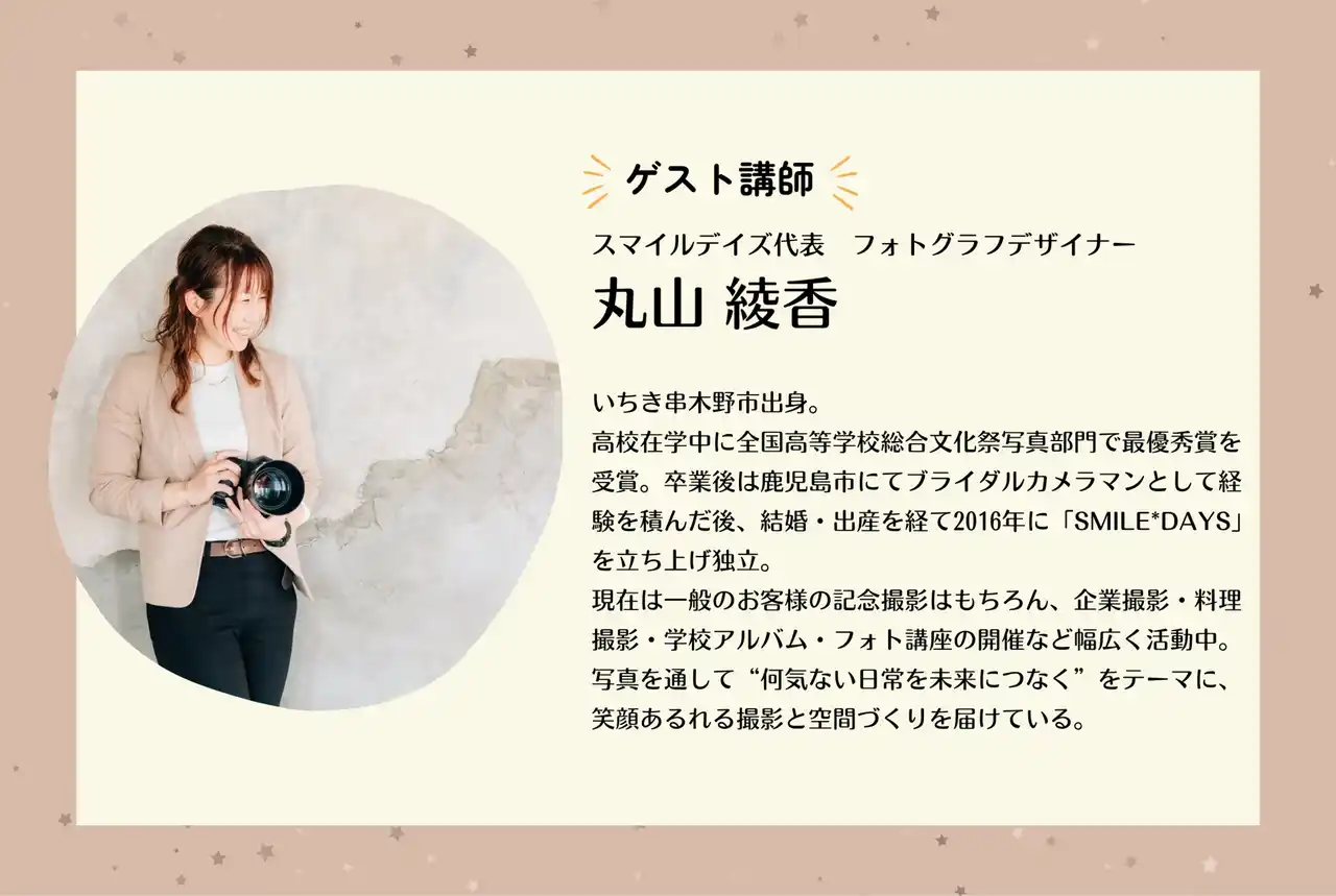 開講に先駆けて、2025年9月4日(木)10時よりMINATOよりあいオフィスとオンライン(Zoom)で説明会を開催いたします。説明会では、10月にスタートする講座の内容を詳しくお伝えするとともに、実際に自分が望む働き方を実現しているフリーランスカメラマンの丸山綾香さんに、ゲスト講師としてお越しいただきます。 |