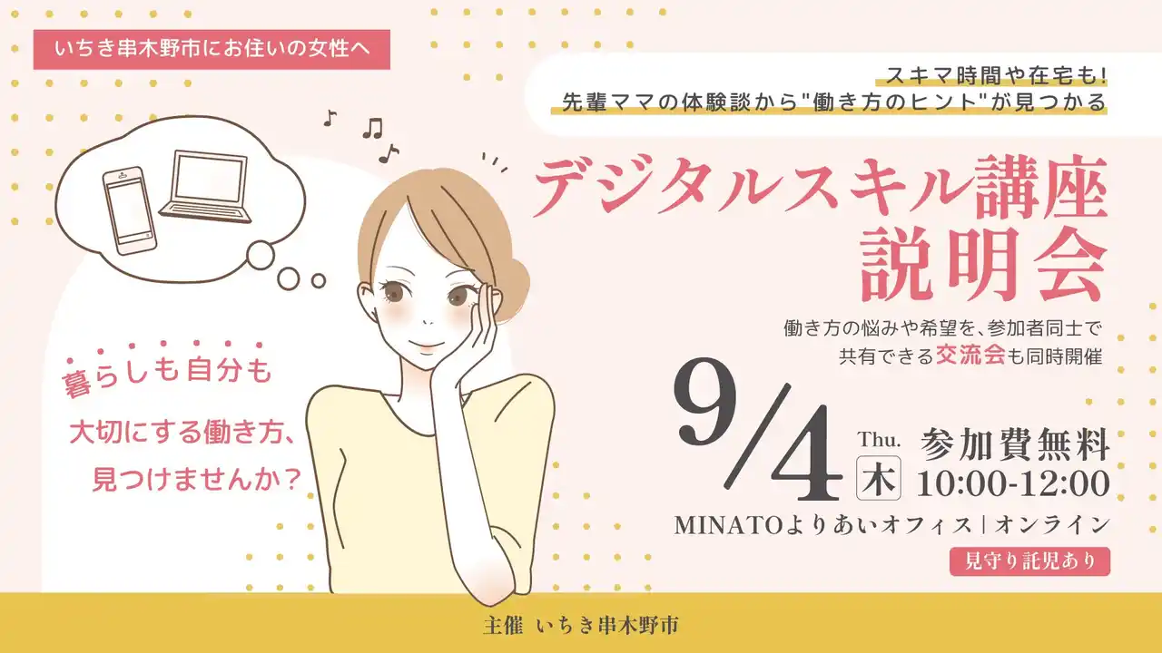 いちき串木野市(運営:株式会社Asian Bridge)は、子育て世代の女性の「働きたい」を応援するため、地域初の「デジタルスキル講座」を開講します。講座は全5回で、10月から開始します。講座では在宅ワークやオフィスワークでよく使われるチャットツールの使い方をはじめ、デジタルツールの基本や、わかりやすい資料づくりのコツなどを学んでいきます。 |