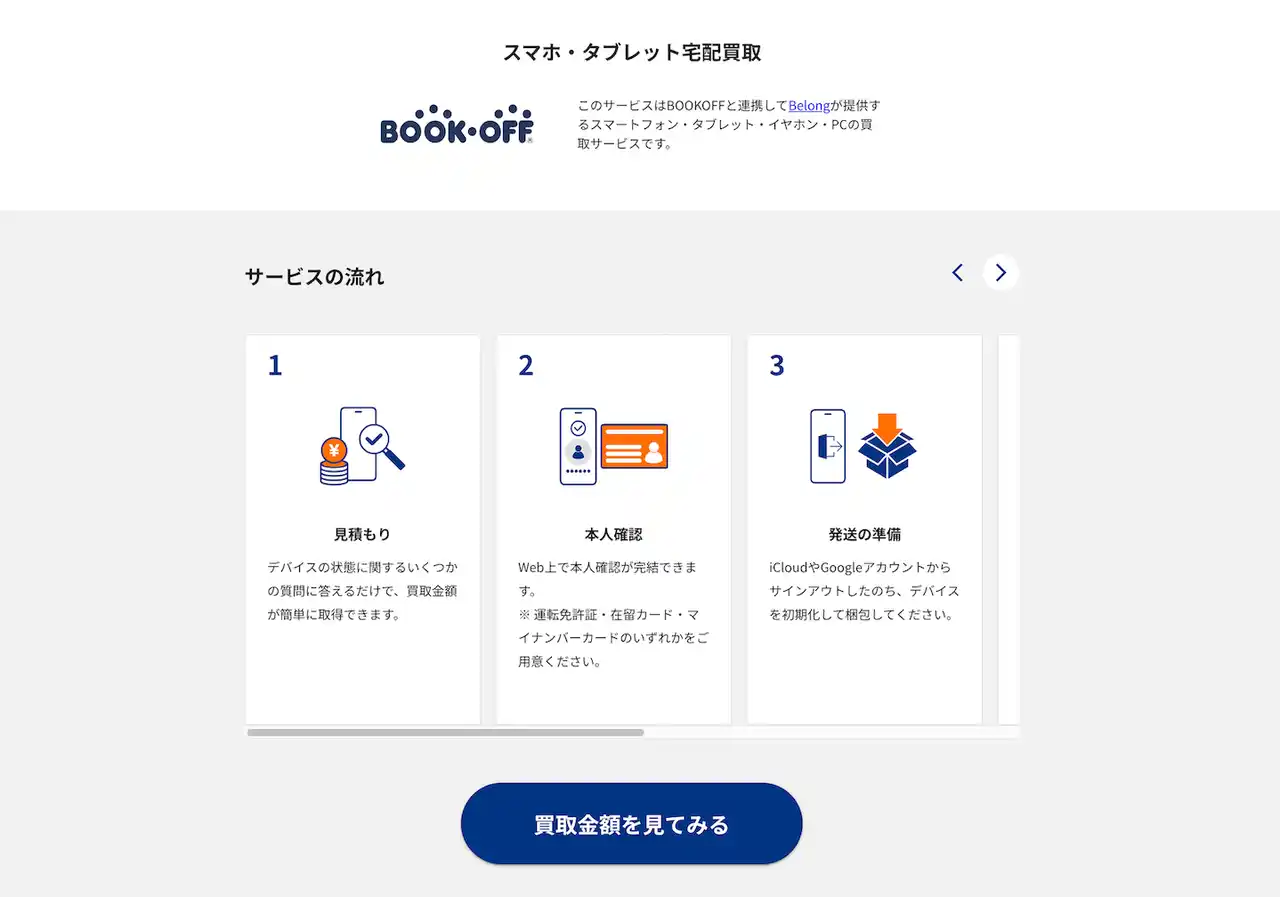 ブックオフが運営する「BOOKOFFサービスサイト」に、当社の個人向けスマートフォン買取サービス「スマホ・タブレット宅配買取」を提供します。これにより「BOOKOFFサービスサイト」における、スマートフォン・タブレット等に特化した簡単かつシンプルなオンライン買取体験を実現させ、「BOOKOFF」の店舗・公式オンラインストアでより柔軟にスマートフォン・タブレット等を売却できる環境を構築することで、「BOOKOFF」顧客の利便性向上に貢献してまいります。 |