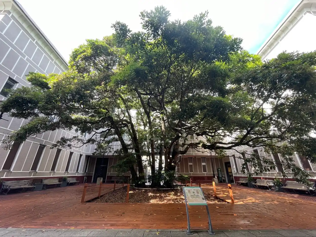 当館中庭で大きく枝葉を伸ばす現在のたまくすの木と、クラウドファンディングによって整備完成したバリアフリーデッキ |