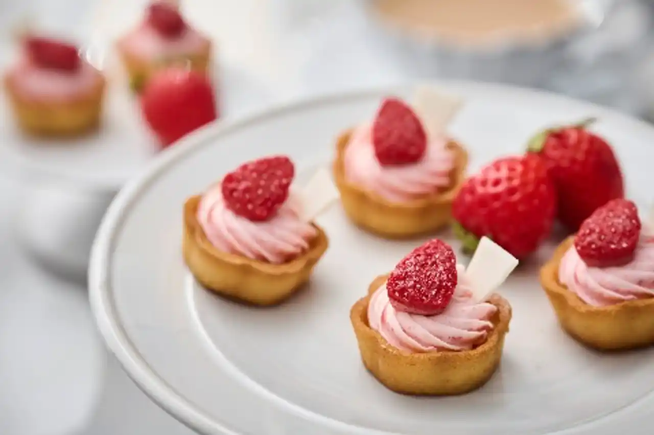 サクサクのタルトに甘酸っぱいミックスベリージャムとクリームを絞り、チョコレートと苺を飾った一口サイズのタルト。 |