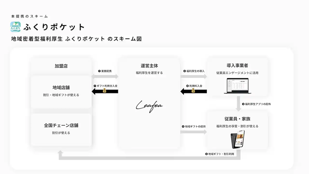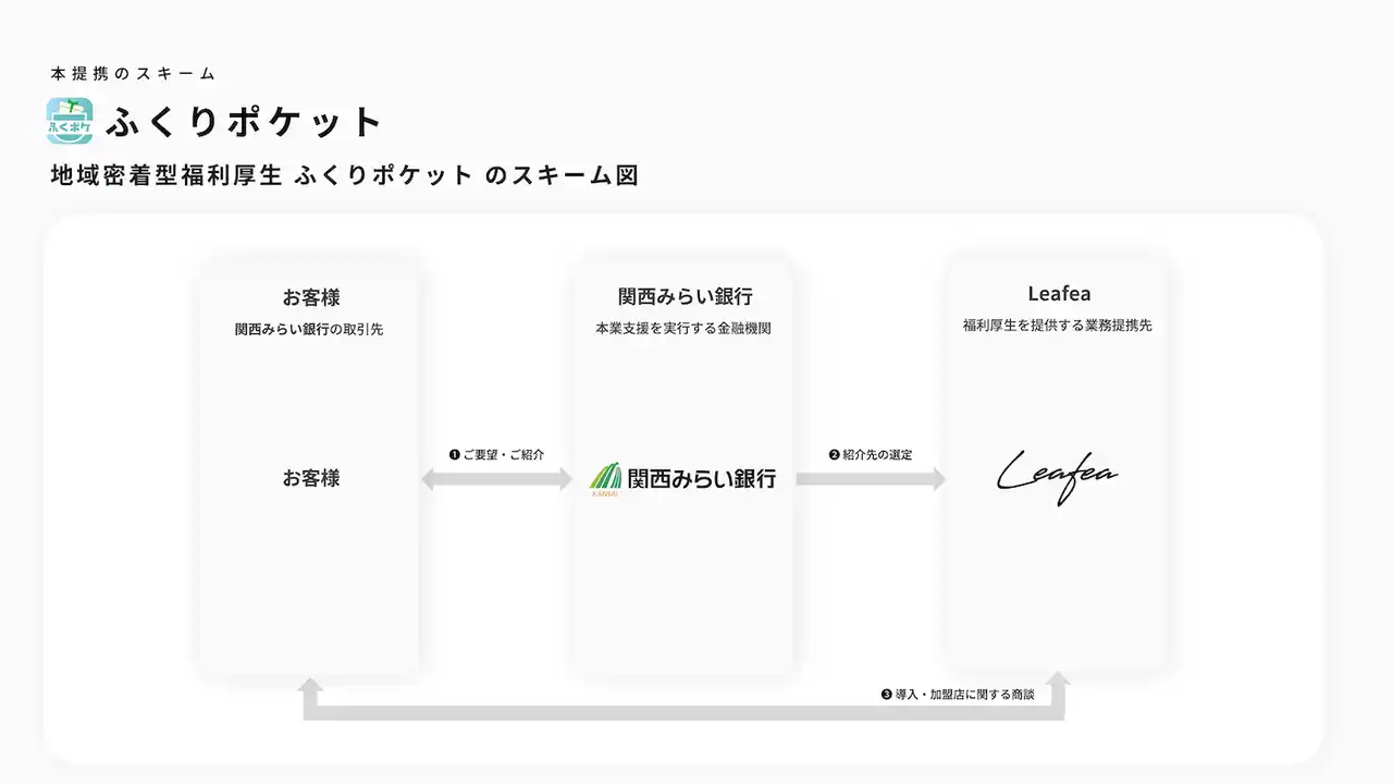 地域密着型福利厚生サービスを提供する株式会社Leafea(本社:東京都中央区、代表取締役:森田 渉、以下リーフィ)は、関西みらい銀行(本店:大阪府大阪市、代表取締役社長:西山 和宏)と提携を開始します。9月1日(月)より関西みらい銀行で地域密着型福利厚生サービス「ふくりポケット」の取扱を開始し、地域創生と日々頑張る方の支援を目指します。 |