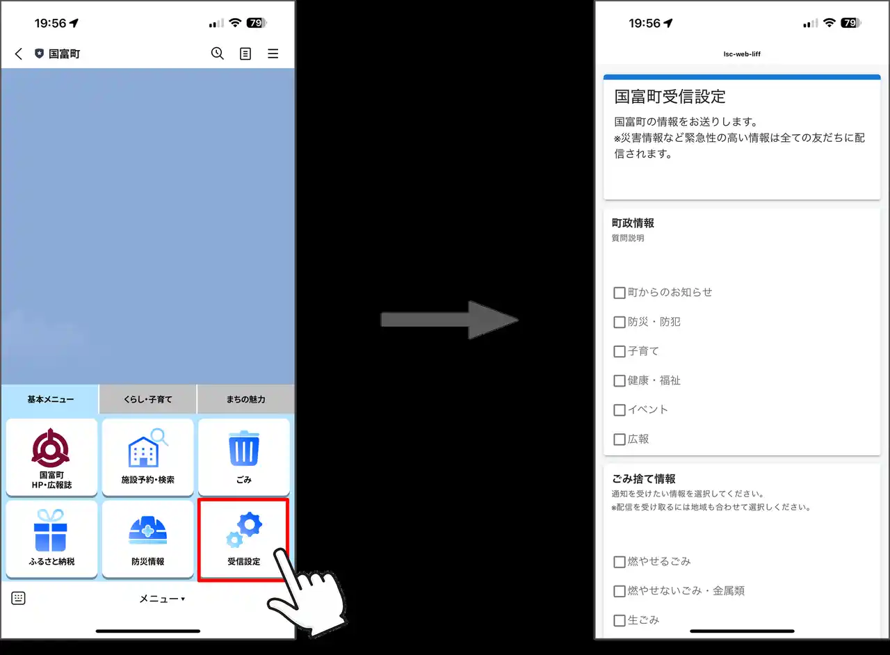 これまでは、国富町LINE公式アカウントの友だちすべてに送られていた配信を、必要な情報カテゴリーだけ選択して受信できる機能の搭載。住民ユーザーは必要な情報だけを取得することができるため、より効果的な行政の情報発信が期待できます。 |
