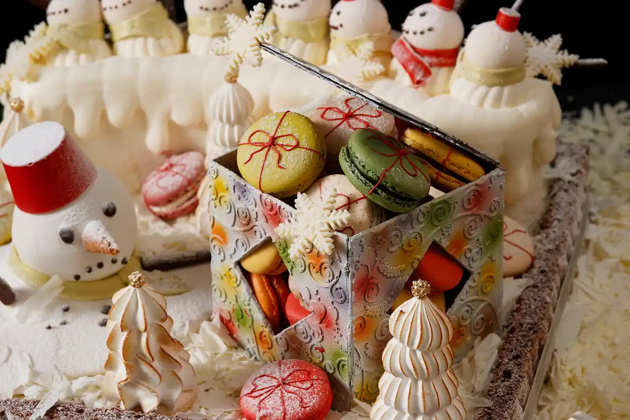 香ばしく焼き上げたアップルパイを土台に、ショートケーキでできた真っ白な雪の丘を重ね、愛らしい7体の雪だるまたちが寄り添い、楽しげにクリスマスキャロルを歌う様子を表現しました。中央には、雪だるまたちからの“心温まる贈り物”として10種類のフレーバーが揃う色とりどりのマカロンを約30個詰めたチョコレートのプレゼントボックスをご用意。忘れられないクリスマスの思い出を演出する、遊び心あふれる一品です。 |