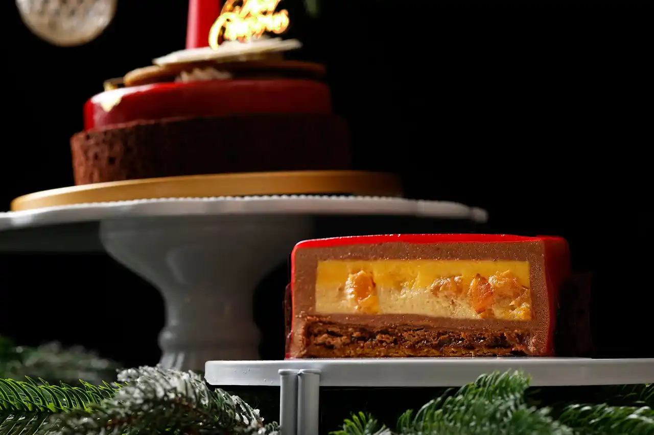 真紅のグラサージュとスタイリッシュなサンタの帽子が印象的な「SANTA」。濃厚なアプリコットチョコレートムースに、爽やかなクレームアプリコット、塩キャラメルが効いたなめらかなマスカルポーネムース、香ばしい塩キャラメルクランチを閉じ込めました。多彩な味わいと食感が織りなす絶妙なバランスをご堪能いただける一品です。 |
