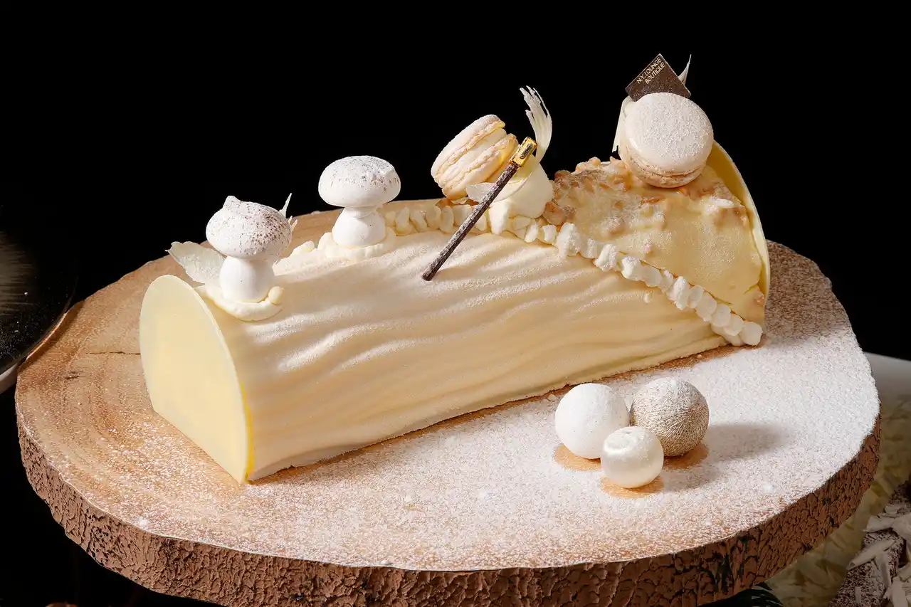 輝く雪が降り積もった切り株を思わせるブッシュ・ド・ノエル |