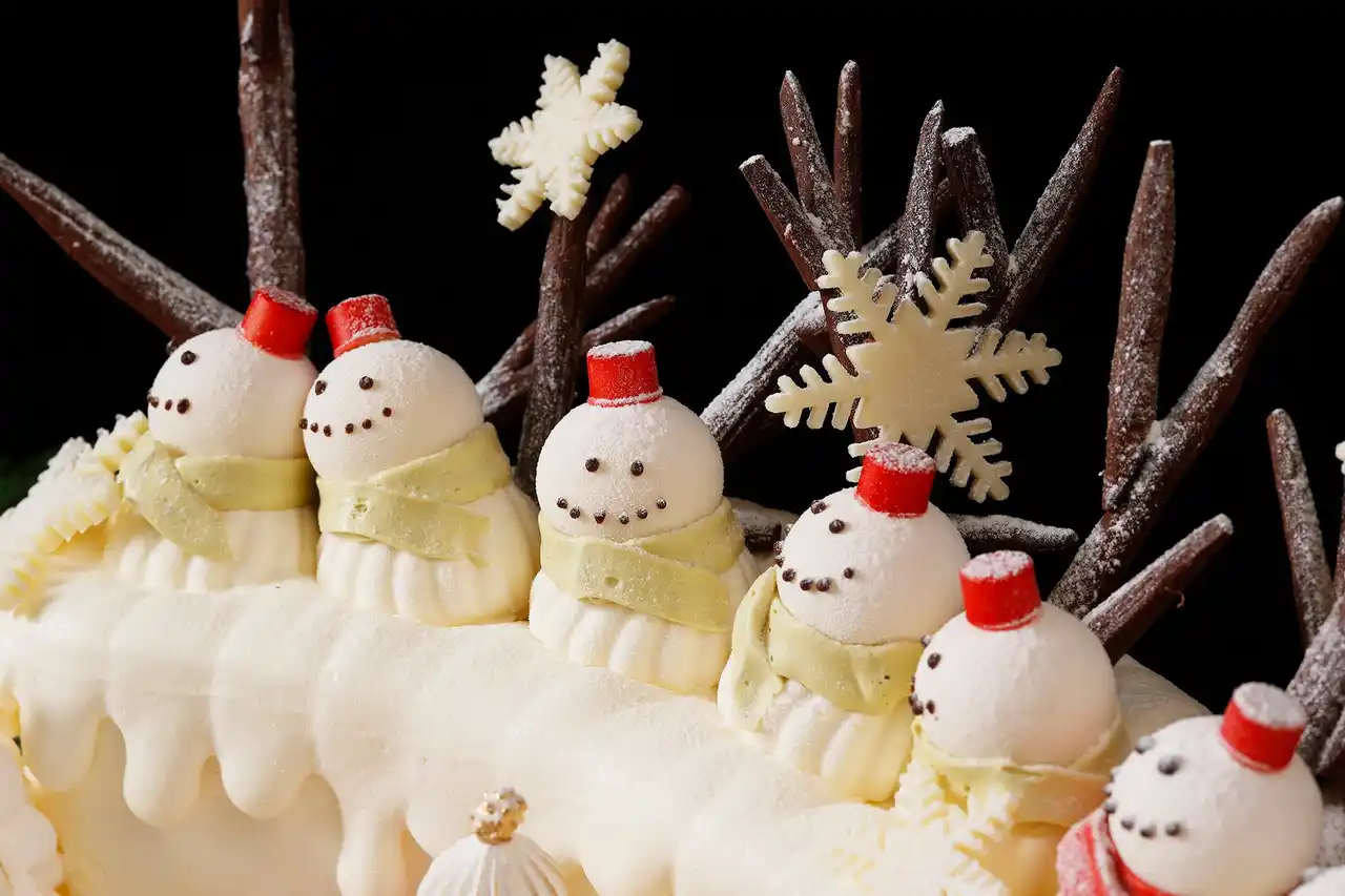また、10セット限定のスペシャルケーキとして楽しげに歌う雪だるまの村を描いた「Snowman Village ~Heartwarming Gift~」が登場。土台の香ばしいアップルパイの上にショートケーキでできた真っ白な雪の丘が広がり、7体の雪だるまたちがクリスマスキャロルを歌っている様子を表現しました。中央に配したチョコレートのプレゼントボックスには、雪だるまたちからの贈り物として10種のフレーバーが揃う色とりどりのマカロンを約30個詰め、パーティーを華やかに演出いたします。 |