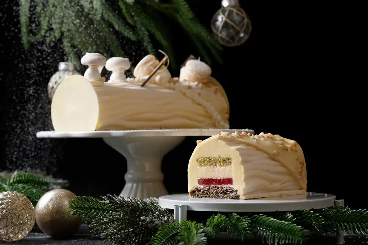 「ルーセント・スノー」は、高知県産柚子を使用した爽やかなムースでピスタチオのダックワーズとレモンジンジャークリーム、甘酸っぱいベリーのジュレを包んだ、雪の切り株を思わせるブッシュ・ド・ノエルです。土台の香ばしい黒ゴマビスキュイと柚子クランチが心地よい食感を加え、和の素材が織りなす斬新なハーモニーをお楽しみいただけます。 |