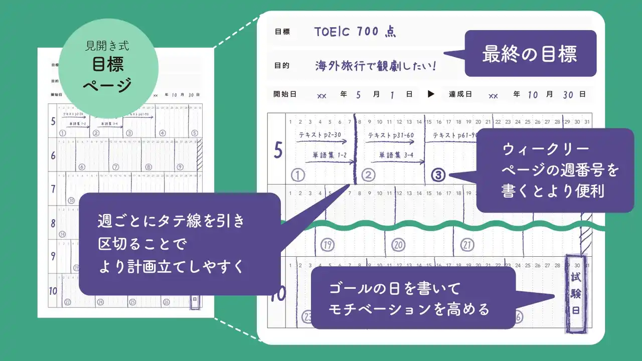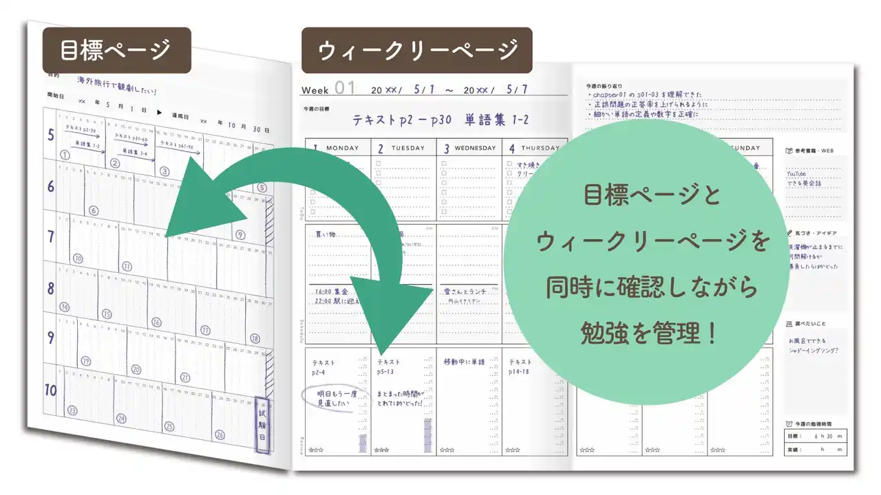 資格試験や短期学習に特化し、いつからでも始められる柔軟さを実現。見開き式目標ページは、ウィークリーページと連携しながら目標に向かっていけるよう設計されています。 |